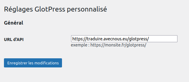 Dans réglages » Glotpress, saisissez l’URL: https://traduire.avecnous.eu/glotpress et enregistrez.