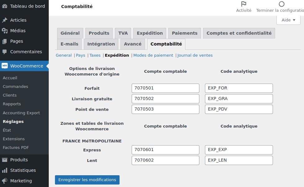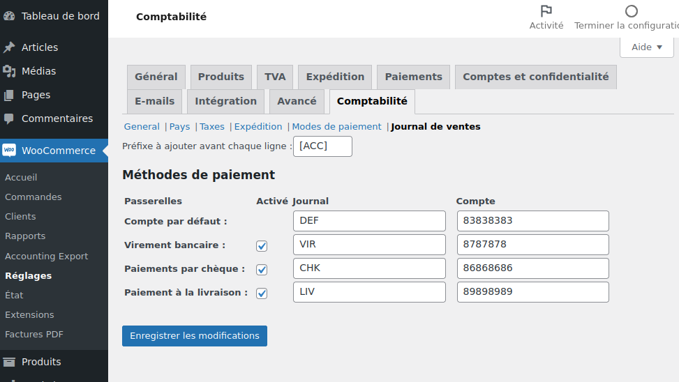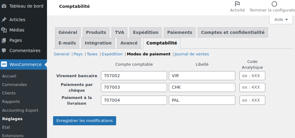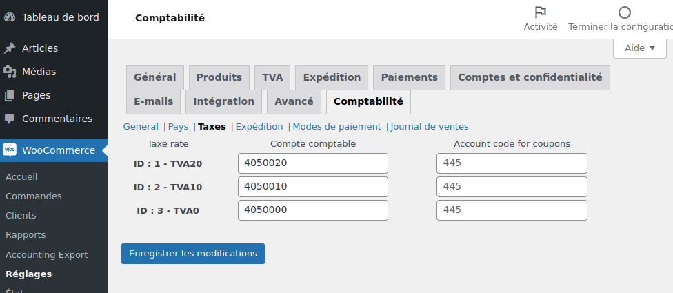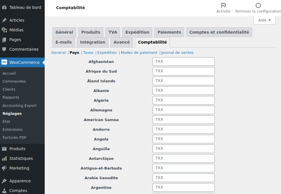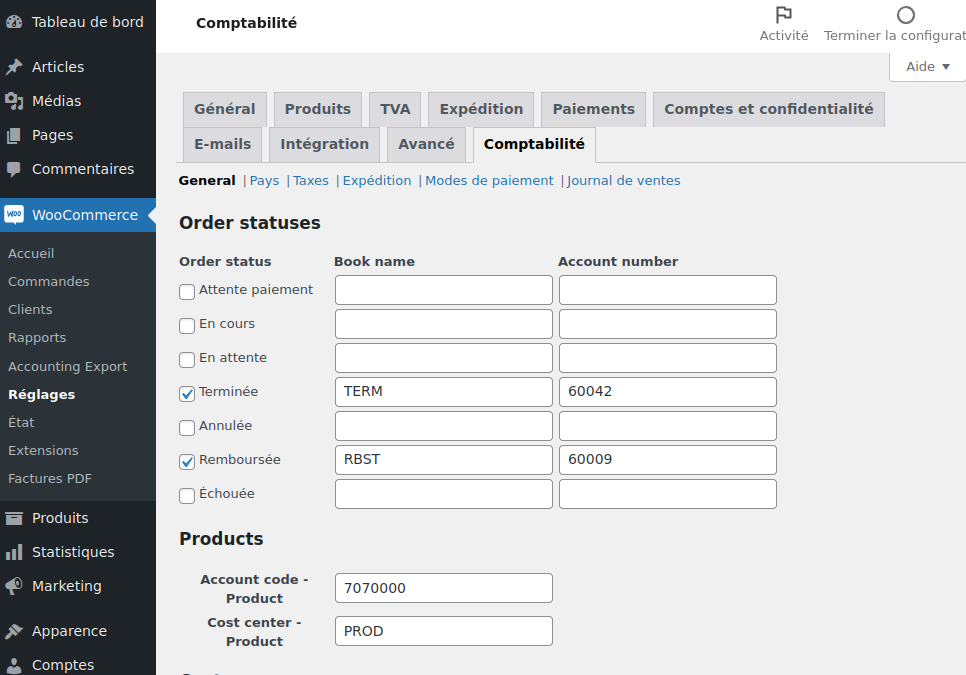 Dans les Réglages de WooCommerce, vous disposez désormais d’un onglet Comptabilité.