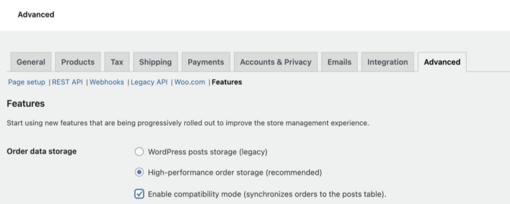 Avant tout dans WooCommerce > Paramètres > Avancé > Fonctionnalités (le dernier). Les options sont tout en haut « High Performance order storage (recommended) » et « Enable compatibility mode (synchronizes orders to the posts tables) ».