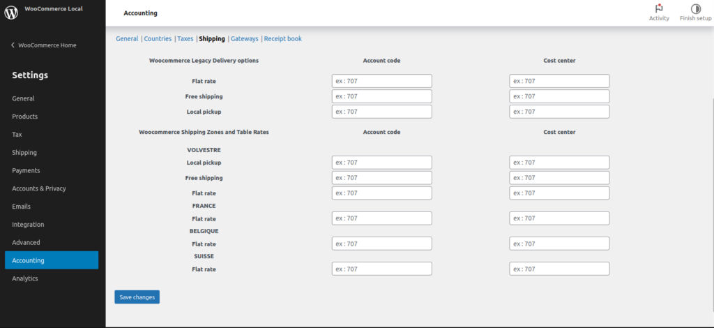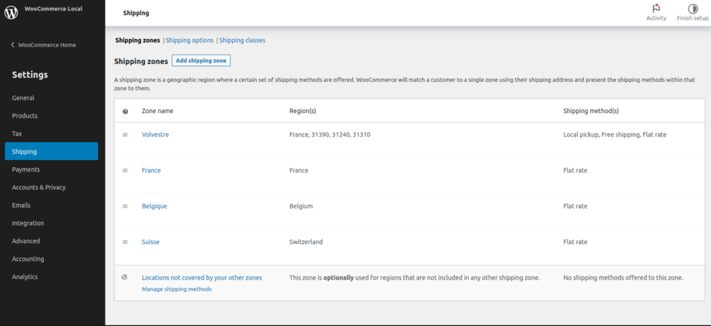 Ceci nécessite d’avoir paramétré les zones expéditions différentes. WooCommerce Accounting se base sur les zones d’expédition de WooCommerce.