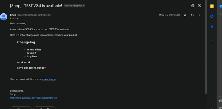 - Lorsque vous publiez une nouvelle version, un e-mail peut être automatiquement envoyé aux acheteurs du produit.