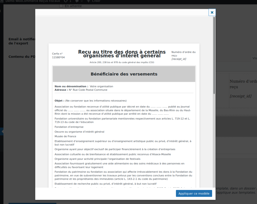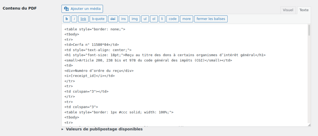 C’est le contenu qui sert à générer le reçu fiscal ponctuel. Il peut être composé de variables qui sont remplacées en fonction de l’utilisateur pour lequel il est généré: