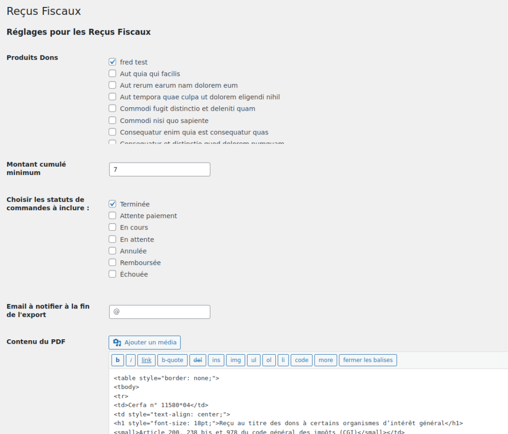Vous devez cocher tous les produits qui peuvent donner lieu à un reçu fiscal. Ce réglage n’est pas rétro-actif (seulement valable pour les prochaines commandes) sauf si c’est explicitement demandé.