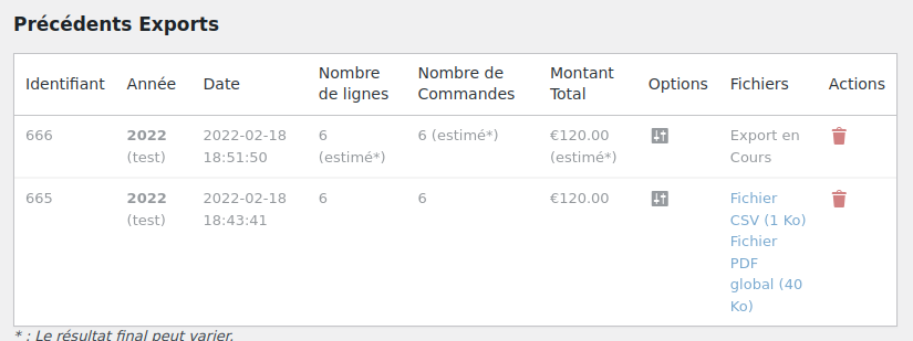 Attention, les nombres de lignes, commandes et le montant total sont calculés avec les commandes qui correspondent aux critères d’export, avant de créer le CSV, le nombre de lignes diminuera car il faut supprimer les utilisateurs sans adresse valide, et ceux qui n’ont pas un minimum cumulé assez élevé pour avoir un reçu fiscal.
